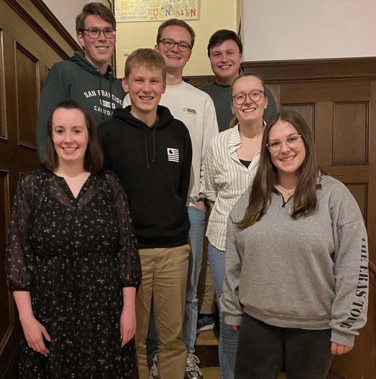 | Kathi (Studierendenreferentin), Lukas (3. Vorsitzender), Verena (2. Vorsitzende), Betti (1. Vorsitzende) hinten: Sören (Beisitz), Nils (Beisitz), Mustafa (Beisitz) |